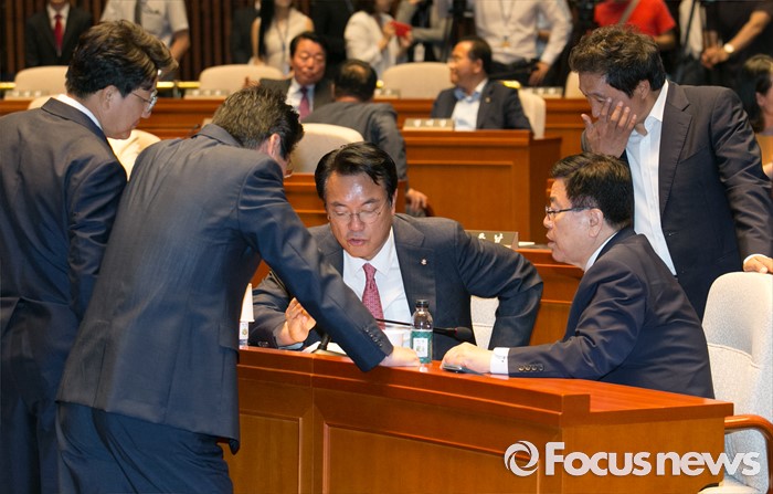 (서울=포커스뉴스) 9일 오후 서울 여의도 국회에서 국회 부의장 후보 선출을 위해 열린 새누리당 의원총회에 참석한 의원들이 논의하고 있다. 왼쪽부터 권성동 사무총장, 강석호 의원, 정진석 원내대표, 김광림 정책위의장, 이학재 비대위원.
