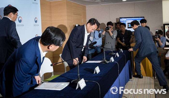 (서울=포커스뉴스) 8일 오전 서울 종로구 정부서울청사에서 유일호 부총리 겸 기획재정부 장관, 이기권 고용노동부 장관, 임종룡 금융위원장, 주형환 산업통상자원부 장관, 김영석 해양수산부 장관이 구조조정 추진현황 및 계획에 대해 발표하기 위해 착석하고 있다.