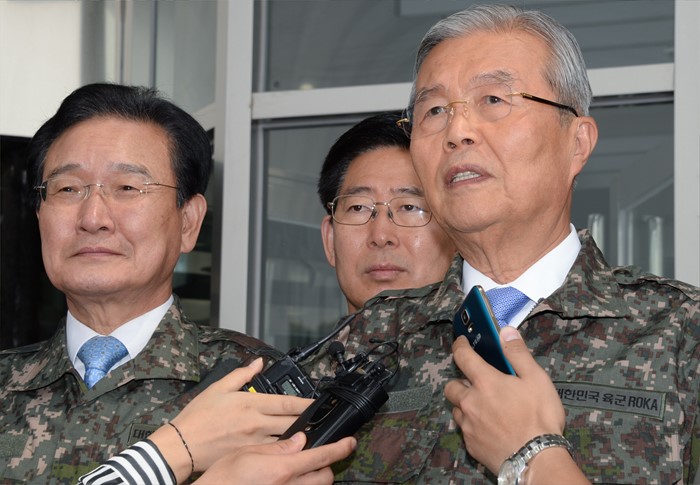 (서울=포커스뉴스) 김종인 더불어민주당 비대위 대표가 8일 오전 서울 용산구 합동참모본부를 방문한 뒤 취재진 질문에 답하고 있다. <사진제공=더불어민주당>