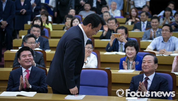(서울=포커스뉴스) 8일 오전 서울 여의도 국회 의원회관에서 열린 국가미래전략포럼(일명 알파포럼) 창립총회 및 강연회에 참석한 정진석(앞줄 가운데) 새누리당 원내대표가 내빈소개에 박수를 받고 있다. 이날 정 원내대표와 서 전 최고위원은 국회의장직을 야당에 양보한다는 뜻을 밝혔다.