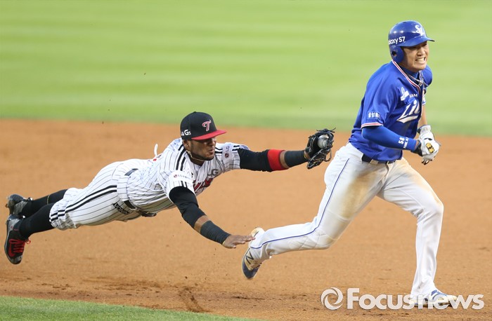 (서울=포커스뉴스) 8일 서울 잠실구장에서 열린 2016 프로야구 삼성-LG 경기 3회초 1사 1루에서 삼성 최형우 타석때 LG 투수 류제국의 견제구로 런다운에 걸린 1루주자 박해민이 히메네스에게 태그아웃되고 있다.