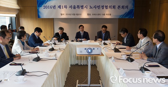(서울=포커스뉴스) 박원순 서울시장과 각계 위원들이 8일 오후 서울 중구 프레스센터에서 열린 2016 제1회 서울시 노사민정협의회 본회의에 참석하고 있다. 서울시 노사민정협의회 구성 후 협의회구성원 모두가 한자리에 모이는 것은 15년 만이다.
