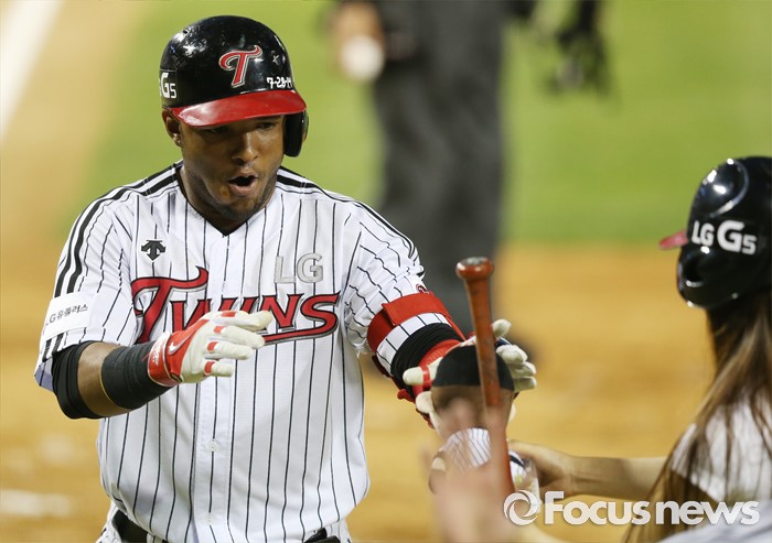 (서울=포커스뉴스) 9일 서울 잠실구장에서 열린 2016 프로야구 삼성-LG 경기 5회말 1사 1,2루에서 LG 정주현이 2타점 중전 안타를 치고 한혁수 코치의 축하를 받고 있다.