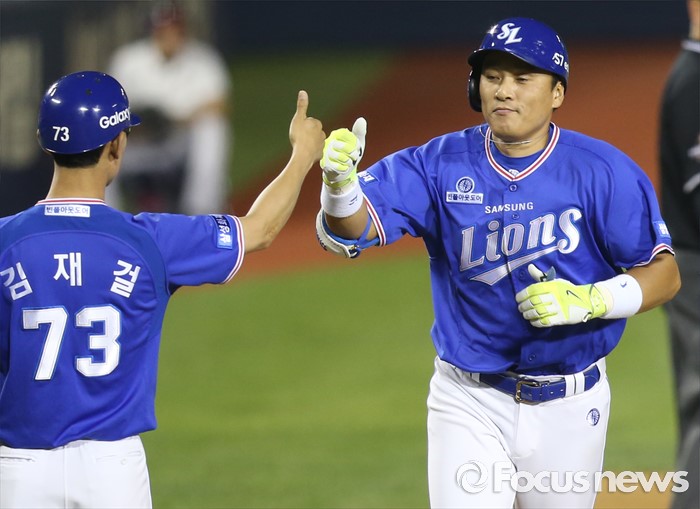 (서울=포커스뉴스) 7일 서울 잠실구장에서 열린 2016 프로야구 삼성-LG 경기 8회초 2사 1,2루에서 삼성 이승엽이 우월 3점 홈런을 치고 3루를 돌면서 김재걸 코치의 환영을 받고 있다.