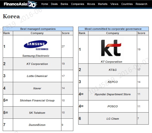 KT는 아시아의 최고 기업 2016에서 국내 기업 가운데 지배구조 1위뿐 아니라 최고 경영기업(Best Managed Companies) 및 최고 IR기업(Best at investor relations) 부문에서 각각 2위로 선정되는 성과를 거뒀다. 글로벌 투자 전문가들의 KT에 대한 호의적 평가는 KT 최고재무책임자(CFO)인 신광석 전무를‘최고의 CFO(Best CFO)’ 1위에 올렸다. KT의 그룹사인 KTH도 중소형 종목(small cap) 부문에서 2위를 차지하며 글로벌 투자자들에게 높은 평가를 받았다.