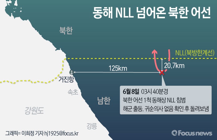 (서울=포커스뉴스) 합동참모본부는 8일 오전 3시 40분경 북한 어선 1척이 동해 상 북방한계선(NLL)을 넘어왔다는 신고를 받고 해군 함정이 현장 출동했다고 전했다. 북한 어선은 검색 후 오전 7시 10분경 이북으로 돌려보내 졌다.