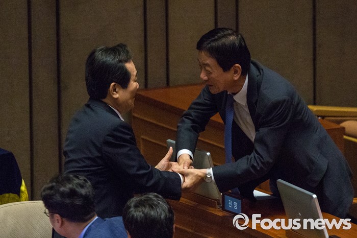 (서울=포커스뉴스) 정세균 더불어민주당 의원과 진영 더불어민주당 의원이 9일 오후 서울 여의도 국회에서 열린 본회의에 참석해 인사 하고 있다.