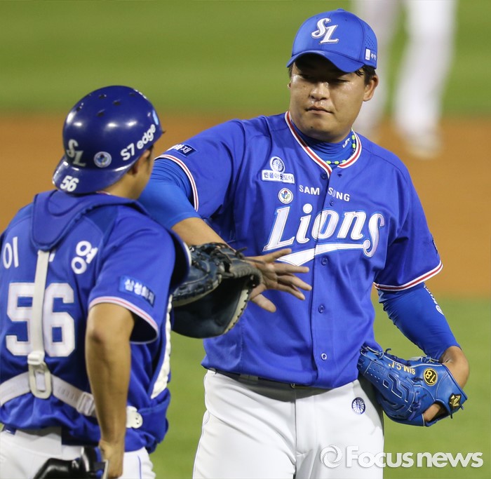(서울=포커스뉴스) 7일 서울 잠실구장에서 열린 2016 프로야구 삼성-LG 경기에서 9회 등판한 삼성 투수 심창민이 경기를 마치고 포수 이지영과 손을 마주치고 있다.