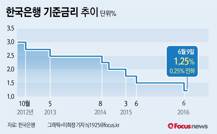 (서울=포커스뉴스) 9일 한국은행은 금융통화위원회(금통위) 정례회의를 열고 6월 기준금리를 기존 1.50%에서 1.25%로 0.25%포인트 내렸다. 기준금리 인하는 지난해 6월 1.75%에서 0.25%포인트 내린 이후 1년 만이다.