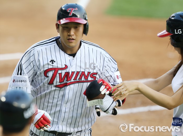(서울=포커스뉴스) 9일 서울 잠실구장에서 열린 2016 프로야구 삼성-LG 경기 2회말 2사후 LG 유강남이 선제 좌월 솔로 홈런을 치고 홈인하며 인형을 받고 있다.