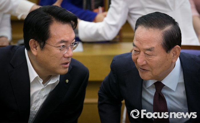 (서울=포커스뉴스) 8일 오전 서울 여의도 국회 의원회관에서 열린 국가미래전략포럼(일명 알파포럼) 창립총회 및 강연회에 참석한 정진석(왼쪽) 새누리당 원내대표와 서청원 전 최고위원이 대화하고 있다. 이날 정 원내대표와 서 전 최고위원은 국회의장직을 야당에 양보한다는 뜻을 밝혔다.