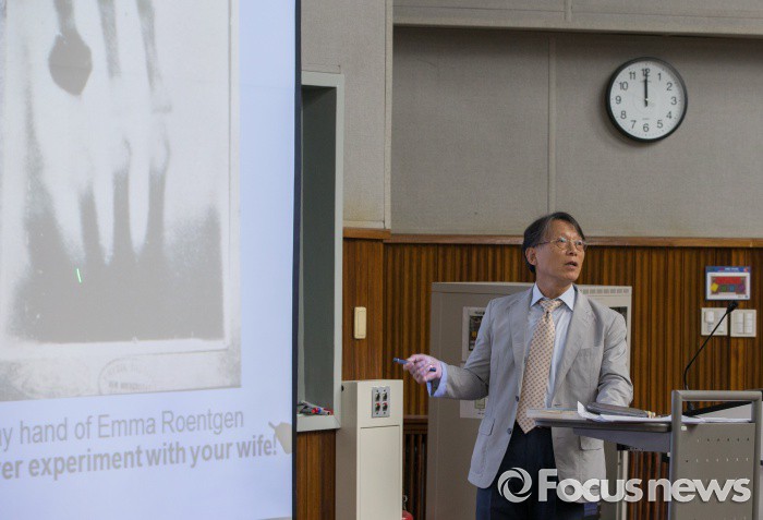(서울=포커스뉴스) 건국대 물리학과 이준택교수 정년퇴임 특별강의가 8일 오후 서울 광진구 능동로 건국대 과학관 201호에서 열렸다. 이교수는 동대학을 나와 독일 마부르크대학에서 이학박사를 받은 후, 1992년 부터, 건국대에서 이과대학장을 거쳐 만 24년간 강의했고, 건국학술대상을 수상했다.핵물리학자인 이교수는 방사능 피폭의 위험성을 알리는 강의는 전국 어디나 찾아가 봉사활동을 하고 있다.(서울=포커스뉴스) 건국대 물리학과 이준택교수 가 8일 오후 서울 광진구 능동로 건국대 과학관 201호에서 마지막 강의를 하고 있다. 2016.06.08 김연수 기자