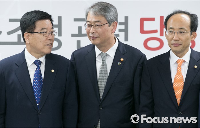 (서울=포커스뉴스) 9일 오전 서울 여의도 국회에서 열린 산업·기업 구조조정 관련 당정간담회에 앞서 김광림(왼쪽) 새누리당 정책위의장과 임종룡(가운데) 금융위원장이 대화하고 있다. 오른쪽 추경호 의원.