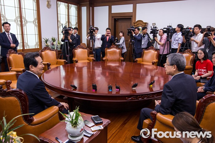 (서울=포커스뉴스) 정세균(왼쪽) 국회의장이 10일 오후 서울 여의도 국회에서 김희옥 새누리당 혁신비상대책위원회 위원장과 면담 하고 있다.