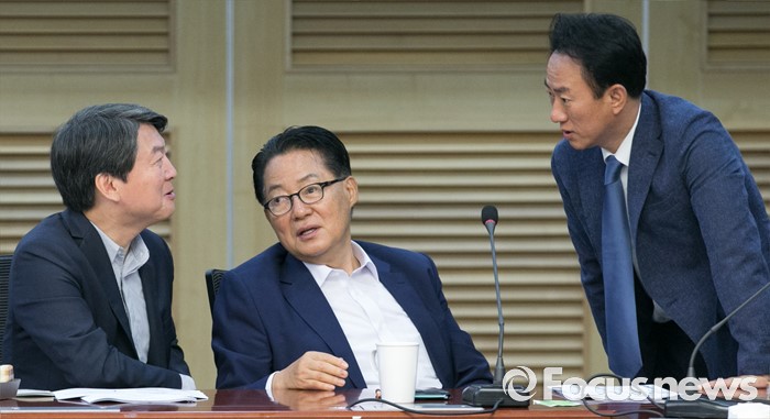 (서울=포커스뉴스) 8일 오전 서울 여의도 국회 의원회관에서 열린 국민의당 12차 정책역량강화 워크숍에 참석한 안철수(왼쪽부터) 상임공동대표, 박지원 원내대표, 김명진 원내대표비서실장이 대화하고 있다.