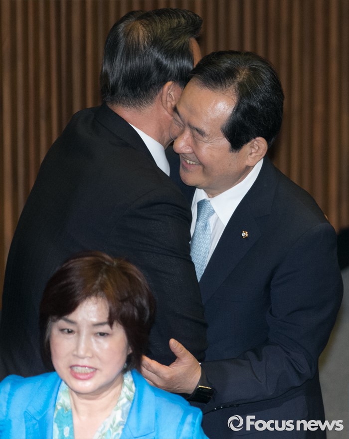 (서울=포커스뉴스) 9일 오후 서울 여의도 국회에서 열린 20대 국회 첫 본회의에 참석한 홍문표(왼쪽) 새누리당 의원과 국회의장 후보인 정세균 더불어민주당 의원이 포옹하고 있다. 정 의원은 이날 20대 국회 전반기 국회의장으로 공식 선출됐다.