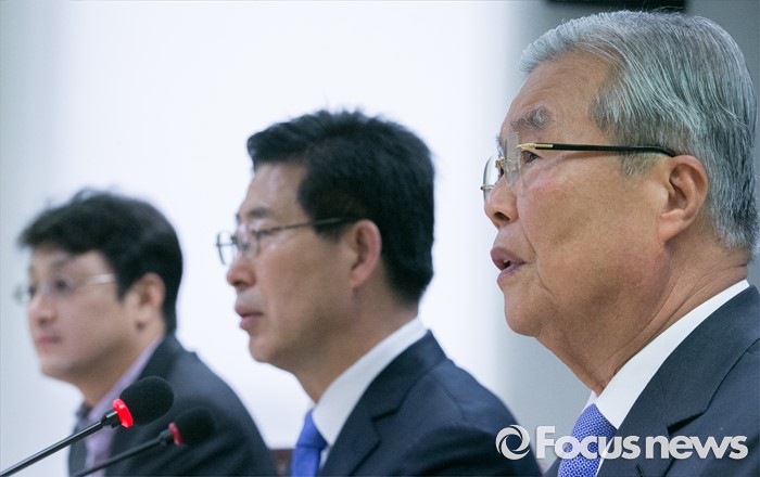 (서울=포커스뉴스) 8일 오전 서울 여의도 민주정책연구원에서 '건강보험 부과체계 개편 방안' 주제로 열린 사회경제포럼에 참석한 김종인 더불어민주당 비대위 대표가 인사말을 하고 있다. 왼쪽부터 이진석 서울대 의대 교수, 양승조 의원, 김 대표.