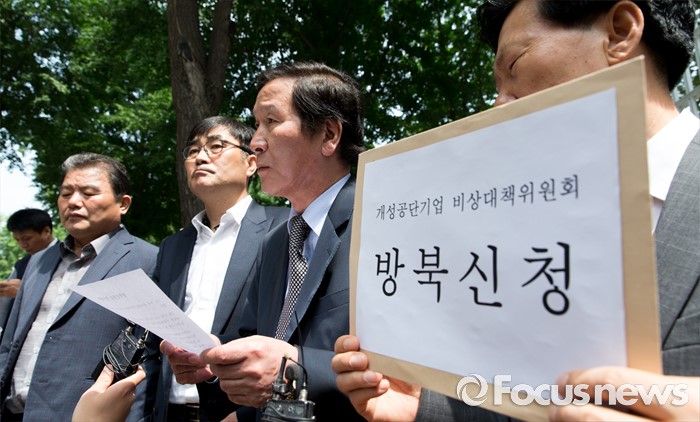 (서울=포커스뉴스) 8일 오전 서울 종로구 정부서울청사 앞에서 정기섭(오른쪽 두번째) 개성공단기업 비상대책위원회 위원장과 관계자들이 통일부에 방북 신청서 제출 전 기자회견문을 낭독하고 있다.