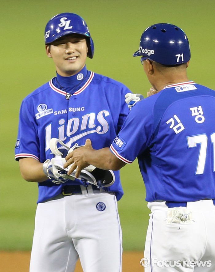 (서울=포커스뉴스) 8일 서울 잠실구장에서 열린 2016 프로야구 삼성-LG 경기 4회초 1사 1,2루에서 삼성 김상수가 1타점 2루타를 치고 김평호 코치의 축하를 받고 있다.