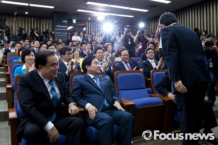 (서울=포커스뉴스) 정세균 더불어민주당 의원이 9일 오전 서울 여의도 국회에서 열린 의원총회에서 20대 국회 전반기 국회의장 후보로 선출된 뒤 동료 의원들에게 인사 하고 있다.