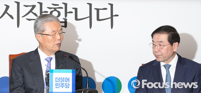 (서울=포커스뉴스) 8일 오전 서울 여의도 국회에서 구의역 스크린도어 노동자 사망 사건과 관련해 열린 더불어민주당-서울시 정책간담회에 참석한 박원순(오른쪽) 서울시장이 김종인 비대위 대표의 발언을 듣고 있다.