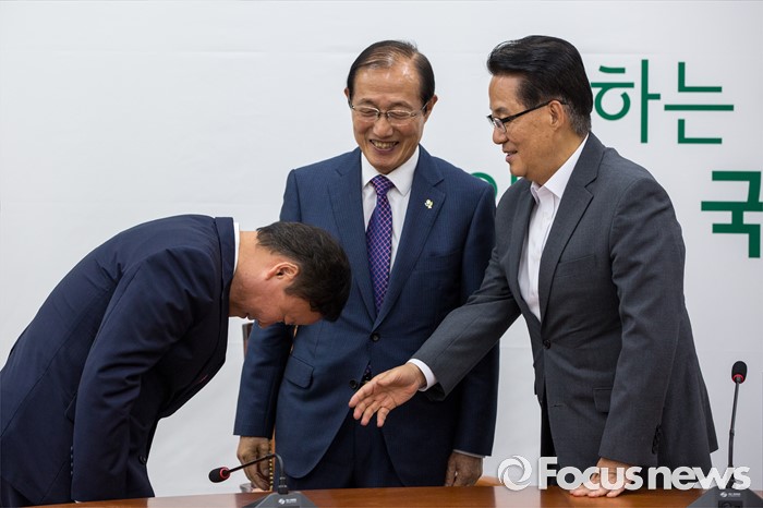 (서울=포커스뉴스) 김재원(왼쪽) 청와대 정무수석이 10일 오후 서울 여의도 국회에서 박지원 국민의당 원내대표와 예방을 마친 뒤 인사 하고 있다.