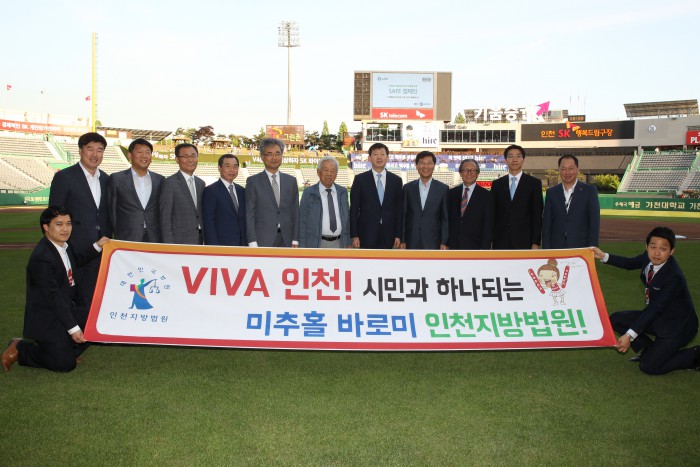 한편 인천지방법원은 늦은 나이에 공부하는 '늦깎이 학생'을 위해 판사가 직접 실생활에 도움이 되는 법률지식을 제공하는 '미추홀바로미 시민공감학교'를 개설해 운영하고 있다.프로야구 SK가 10일 문학구장에서 열리는 NC와의 경기에 '인천지방법원데이' 행사를 연다. 사진은 지난해 열린 '인천지방법원데이' 행사 중 기념촬영 모습. <사진제공=SK 와이번스>