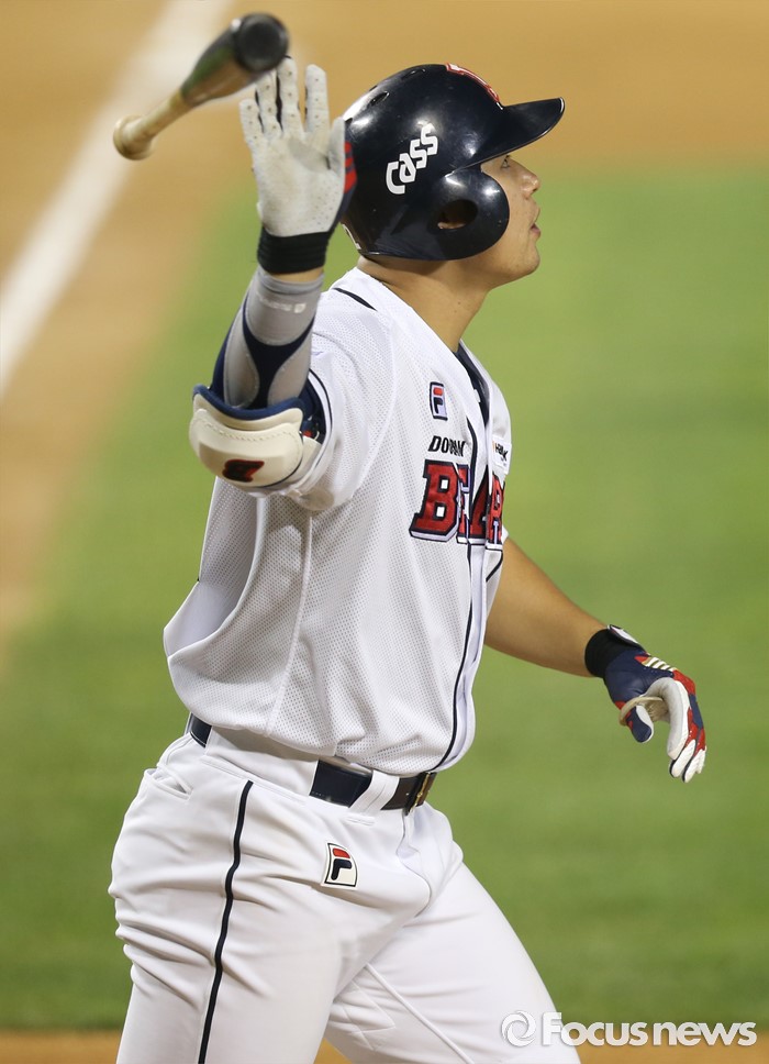 (서울=포커스뉴스) 10일 서울 잠실구장에서 열린 2016프로야구 롯데-두산 경기 6회말 무사 1,2루에서 두산 김재환이 우월 3점 홈런을 치고 담장을 넘어가는 타구를 바라보고 있다.