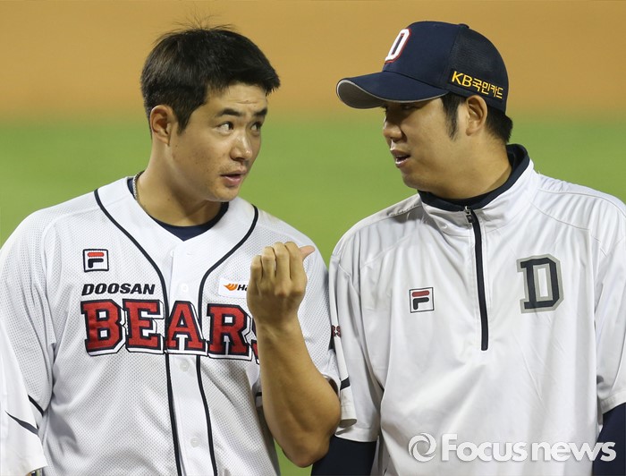 | △ 장원준과 대화하는 김재환 |