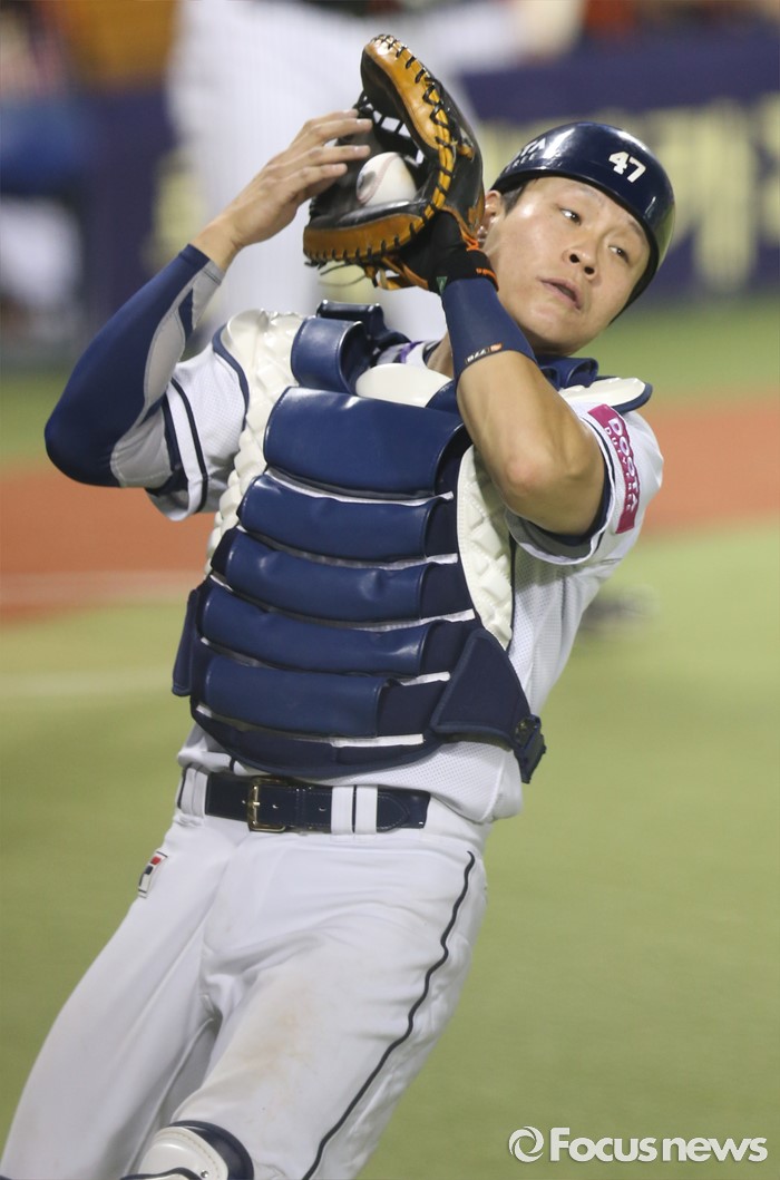 (서울=포커스뉴스) 10일 서울 잠실구장에서 열린 2016프로야구 롯데-두산 경기에서 9회말 두산 포수 박세혁이 롯데 박현도의 파을 볼을 잡고 있다.