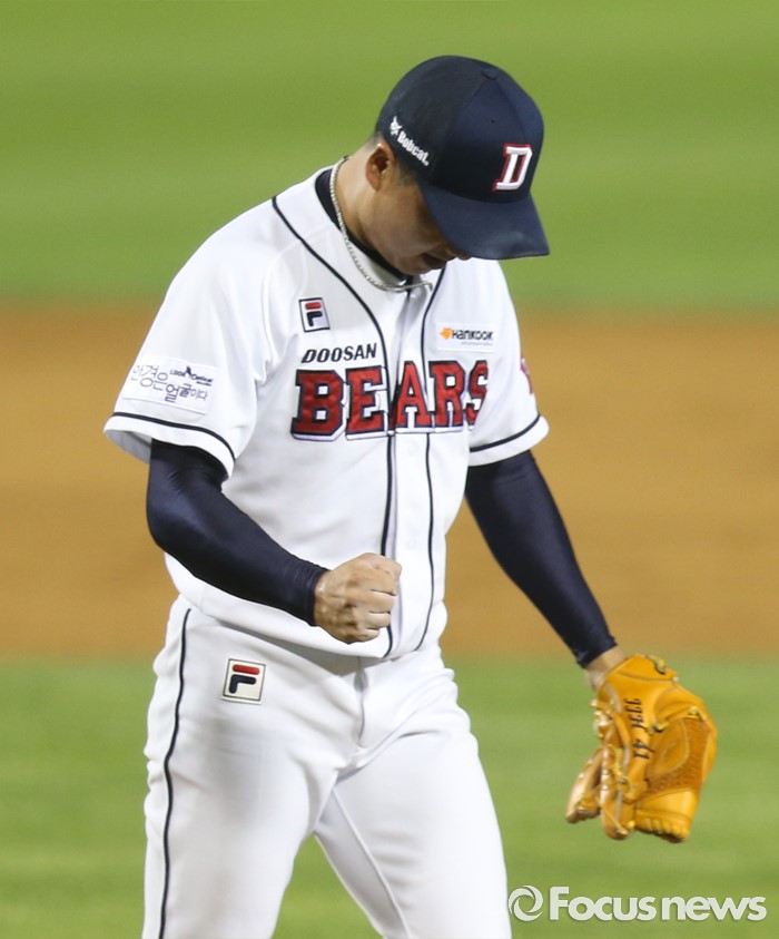 (서울=포커스뉴스) 10일 서울 잠실구장에서 열린 2016프로야구 롯데-두산 경기 8회초 2사 2,3루에서 두산 투수 정재훈이 롯데 강민호를 삼진 아웃시키고 주먹을 불끈 쥐며 마운드를 내려 오고 있다.