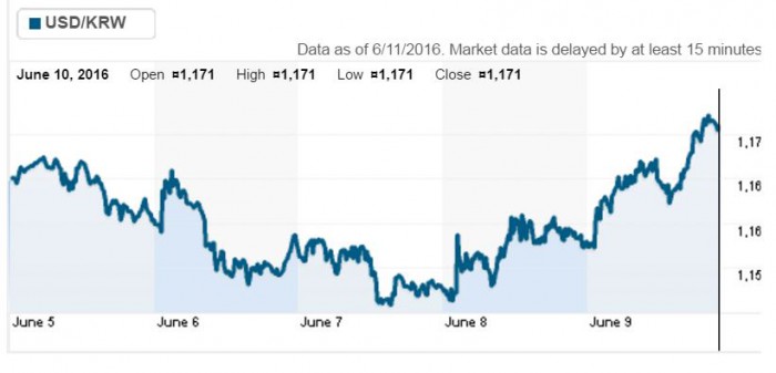 전주 초반 원화 가치는 5월 미국 고용지표를 '부정적'으로 해석하면서 크게 올랐다. 연준이 6~7월에는 연방기금금리를 인상하지 않을 것이라고 봤기 때문이다. 하지만 주 후반으로 갈 수록 원화 가치는 상승폭을 반납하고 다시 하락세를 보였다. 지난 10일 서울 외환시장에서 원·달러 환율은 전 거래일 대비 9.5원 상승한 1165.5원에 장을 마쳤으나, 역외 시장에서는 1171원까지 상승한 상태다.