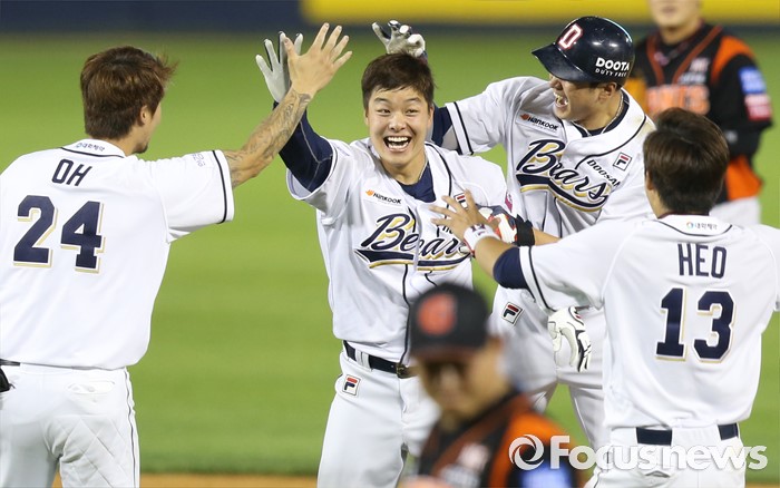 (서울=포커스뉴스) 12일 서울 잠실구장에서 열린 2016 프로야구 롯데-두산 경기에서 연장 11회말 끝내기 2루타를 친 두산 민병헌이 동료들과 환호하고 있다.