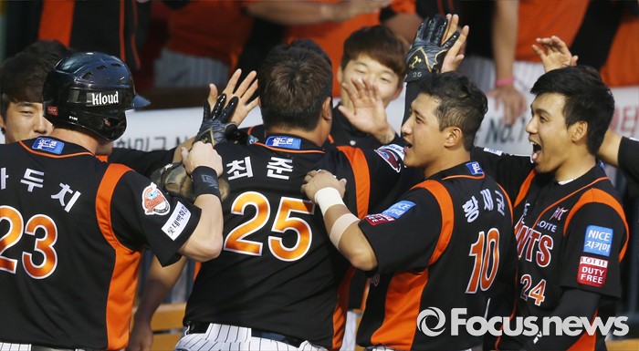 (서울=포커스뉴스) 12일 서울 잠실구장에서 열린 2016 프로야구 롯데-두산 경기 9회초 2사 1루에서 롯데 최준석이 동점 우월 홈런을 치고 덕아웃에서 동료들의 뜨거운 환영을 받고 있다.