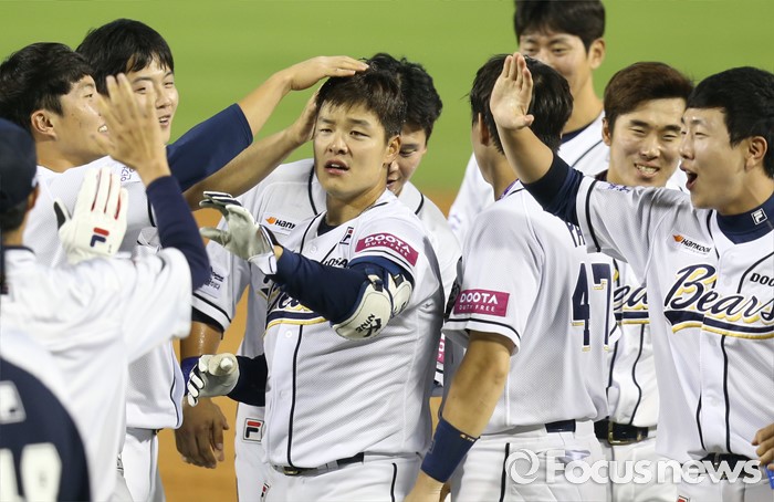 (서울=포커스뉴스) 12일 서울 잠실구장에서 열린 2016 프로야구 롯데-두산 경기에서 연장 11회말 끝내기 2루타를 친 민병헌과 동료들이 환호하고 있다.