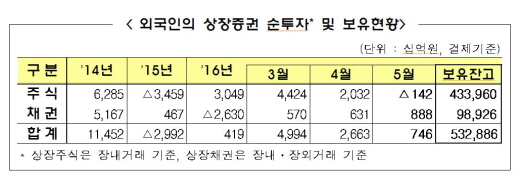 5월말 현재 외국인이 보유한 상장주식 규모는 434조원으로 전체 시가총액의 29.0%를 기록했다. 외국인의 상장채권은 전체 상장채권의 6.2%인 98조9000억원으로 집계됐다.