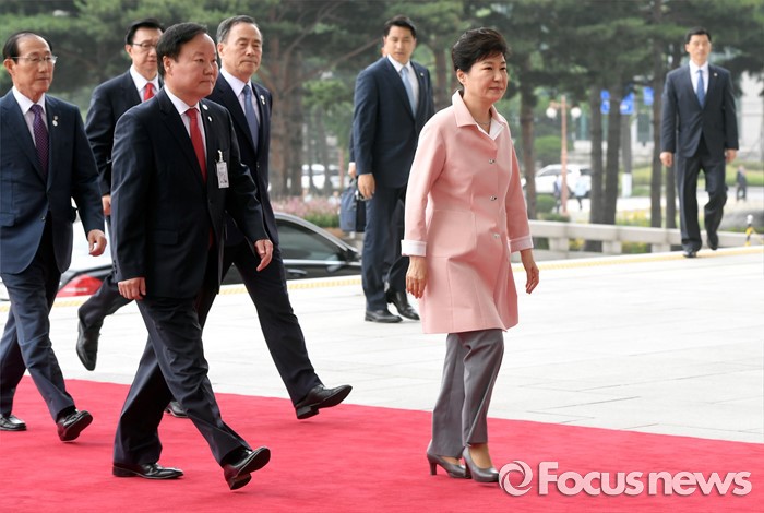 (서울=포커스뉴스) 박근혜 대통령이 13일 오전 서울 여의도 국회에서 열린 20대 국회 개원식 연설을 위해 본청으로 들어서고 있다.