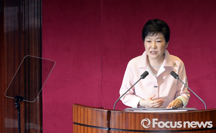 (서울=포커스뉴스) 박근혜 대통령이 13일 오전 서울 여의도 국회에서 열린 20대 국회 개원식에 참석해 연설을 하고 있다.