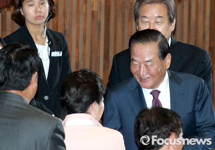(서울=포커스뉴스) 박근혜 대통령이 13일 오전 서울 여의도 국회에서 열린 20대 국회 개원식에 참석해 연설을 마친 뒤 퇴장하며 서청원 새누리당 전 최고위원과 악수하고 있다.