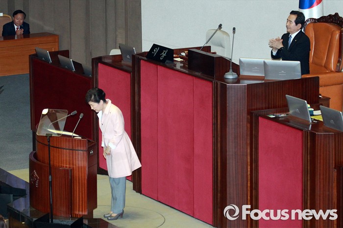 (서울=포커스뉴스) 박근혜 대통령이 13일 오전 서울 여의도 국회에서 열린 20대 국회 개원식에 참석해 연설을 마친 뒤 인사하고 있다.