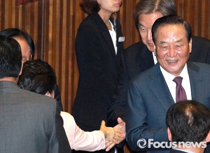 (서울=포커스뉴스) 박근혜 대통령이 13일 오전 서울 여의도 국회에서 열린 20대 국회 개원식에 참석해 연설을 마친 뒤 퇴장하며 김무성 새누리당 전 대표와 인사하고 있다.