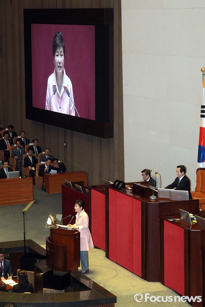 (서울=포커스뉴스) 박근혜 대통령이 13일 오전 서울 여의도 국회에서 열린 20대 국회 개원식에 참석해 연설을 하고 있다.