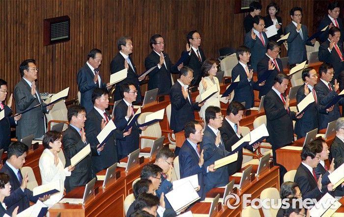 (서울=포커스뉴스) 13일 오전 서울 여의도 국회에서 열린 20대 국회 개원식에 참석한 의원들이 선서를 하고 있다.