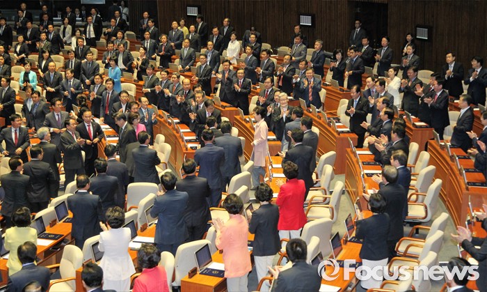 △ 박근혜 대통령 박수로 환영하는 의원들