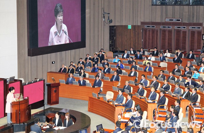 (서울=포커스뉴스) 박근혜 대통령이 13일 오전 서울 여의도 국회에서 열린 20대 국회 개원식에 참석해 연설을 하고 있다.