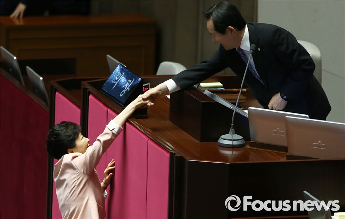 (서울=포커스뉴스) 박근혜 대통령이 13일 오전 서울 여의도 국회에서 열린 20대 국회 개원식에 참석해 연설을 마친 뒤 정세균 국회의장과 악수하고 있다.