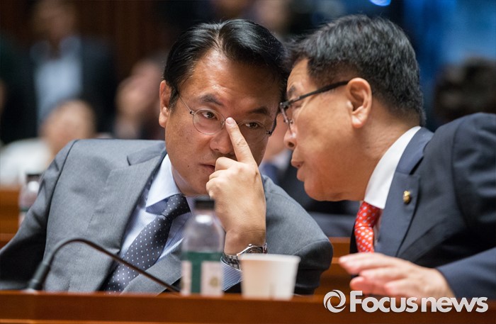 (서울=포커스뉴스) 운영위원장을 맡게 된 정진석(왼쪽) 새누리당 원내대표가 13일 오전 서울 여의도 국회에서 열린 의원총회에 참석해 김광림 정책위의장과 대화하고 있다.