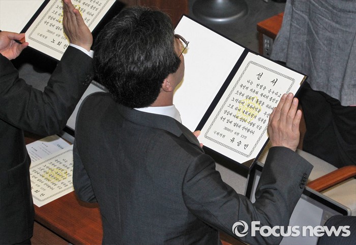 (서울=포커스뉴스) 13일 오전 서울 여의도 국회에서 열린 20대 국회 개원식에 참석한 유승민 무소속 의원이 선서를 하고 있다.
