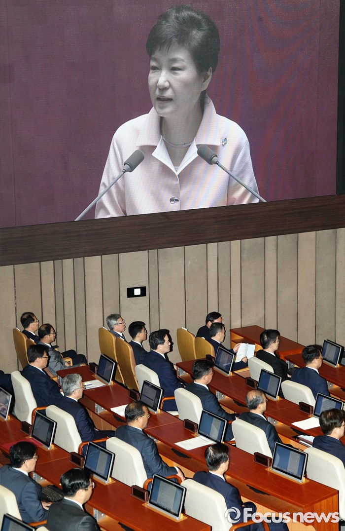 (서울=포커스뉴스) 박근혜 대통령이 13일 오전 서울 여의도 국회에서 열린 20대 국회 개원식에 참석해 연설을 하고 있다.