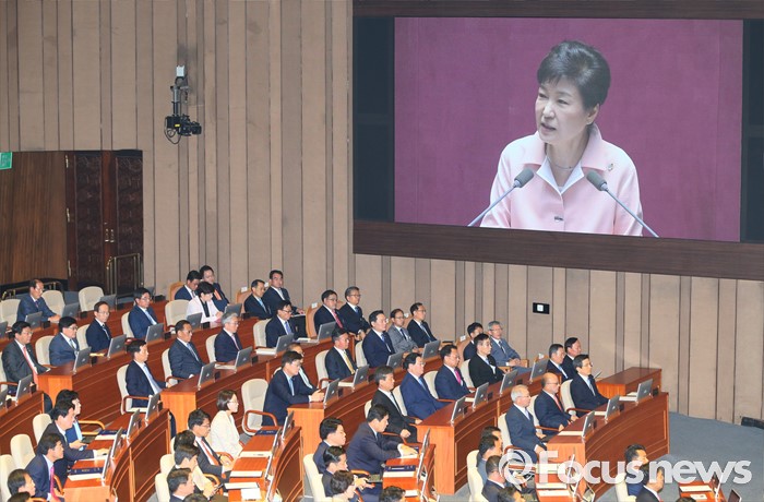 (서울=포커스뉴스) 박근혜 대통령이 13일 오전 서울 여의도 국회에서 열린 20대 국회 개원식에 참석해 연설을 하고 있다.